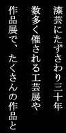| 輪島漆芸技術研修所講師として後継者育成にあたる、伝統工芸作家。 | 漆芸家。繊細な感覚から生まれ出る、造形と意匠の妙をご覧下さい | |||